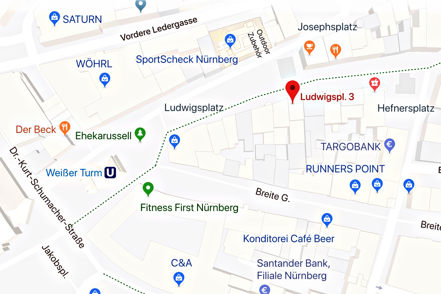 Die Praxis liegt in der Nürnberger Innenstadt am Ludwigsplatz 3, nur 3 Gehminuten von der U-Bahn Haltestelle Weißer Turm entfernt. Mit dem Auto kann man mehrere umliegende Parkhäuser benutzen.